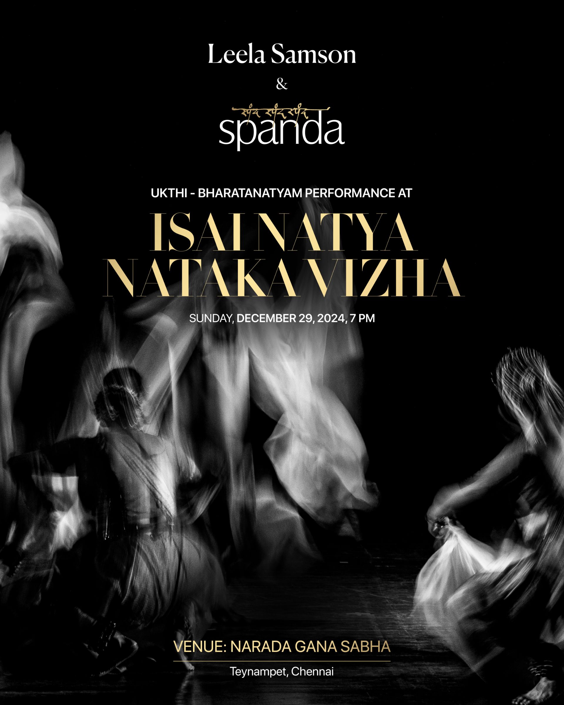 Leela Samson & Spanda present Ukthi - a Bharatanatyam performance at Isai Natya Nataka Vizha on Sunday, December 29, 2024, at 7 PM. Venue: Narada Gana Sabha, Teynampet, Chennai.