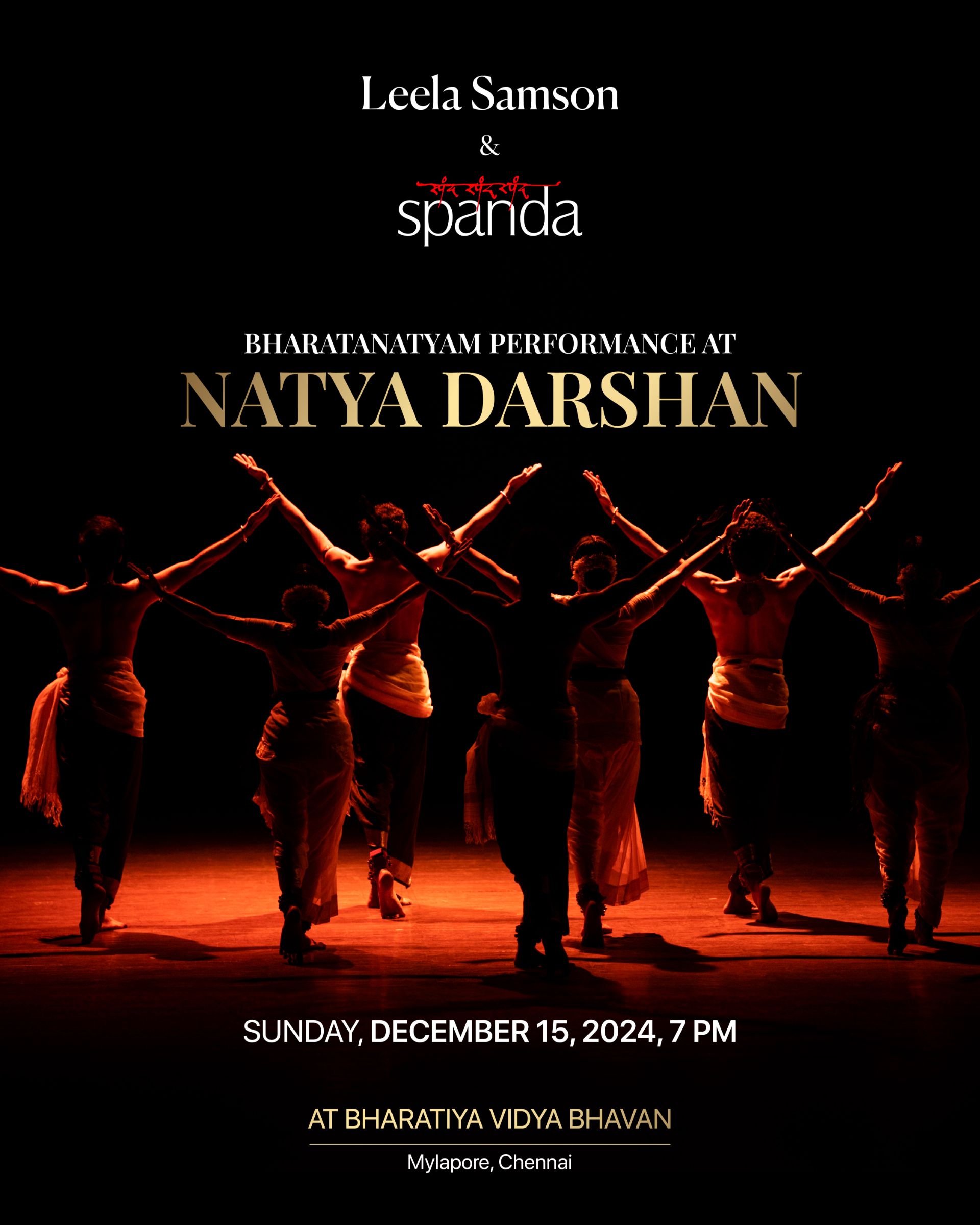 Leela Samson & Spanda perform at Natya Darshan on Sunday, December 15, 2024, at 7 PM. Venue: Bharatiya Vidya Bhavan, Mylapore, Chennai.